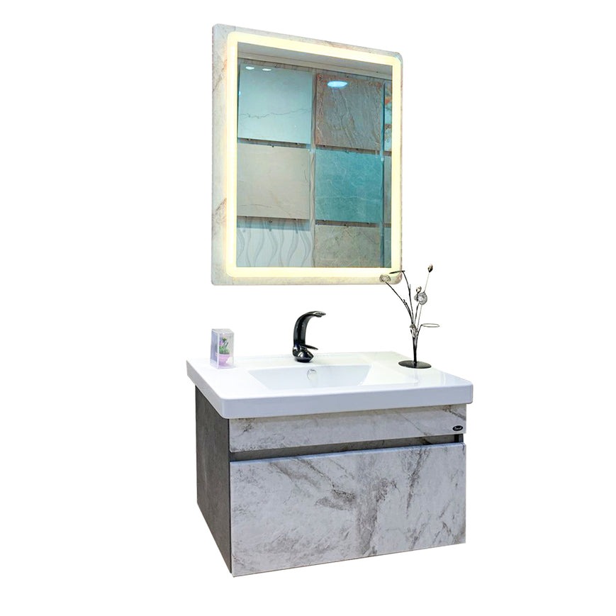 ( طلب مسبق ) وحدة حمام خشب كونتر جودوود الين بلس 60 سم بالحوض ديورافيت 1 درج والمرآة ليد اللون رخامي جراي من دانيال